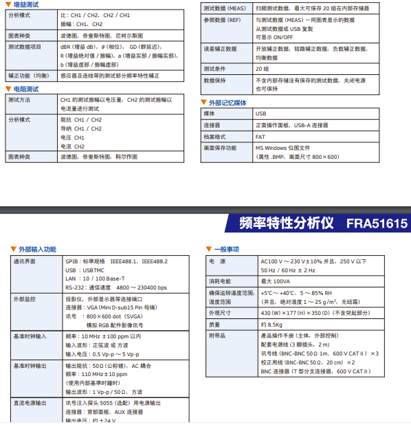 FRA51615频率特性分析仪在被测定物上施加正弦波信号,求出其频率响应特性的装置,因为测量的动态量程非常宽阔,所以不但能够进行高精度的测量,而且具有可以测量超低频率等特长。