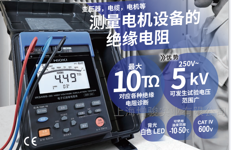 日置IR3455-30高压绝缘电阻计用于测量高压设备(变压器、线缆、马达等)的绝缘电阻,试验电压范围广250V~5kV,测量范围广,最大10TΩ。最小25V步进精确设置。此外最大PI(成极指数),DAR(诱电吸收比)的自动计算/显示和测量步进电压,温度补偿,温度测量,泄露电流显示等绝缘诊断所必须的功能全面。