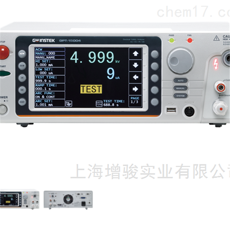 固纬GPT-15003/GPT-15004 安规测试仪输出设置/测量范围: 交流耐压测试(AC 5kV/100mA max)、直流耐压测试(DC 6kV/20mA max)、绝缘电阻测试(DC 1200V/50GΩ max)、接地电阻测试(AC 32A/650mΩ max)、接地导通测试(DC100mA/70Ω max)。