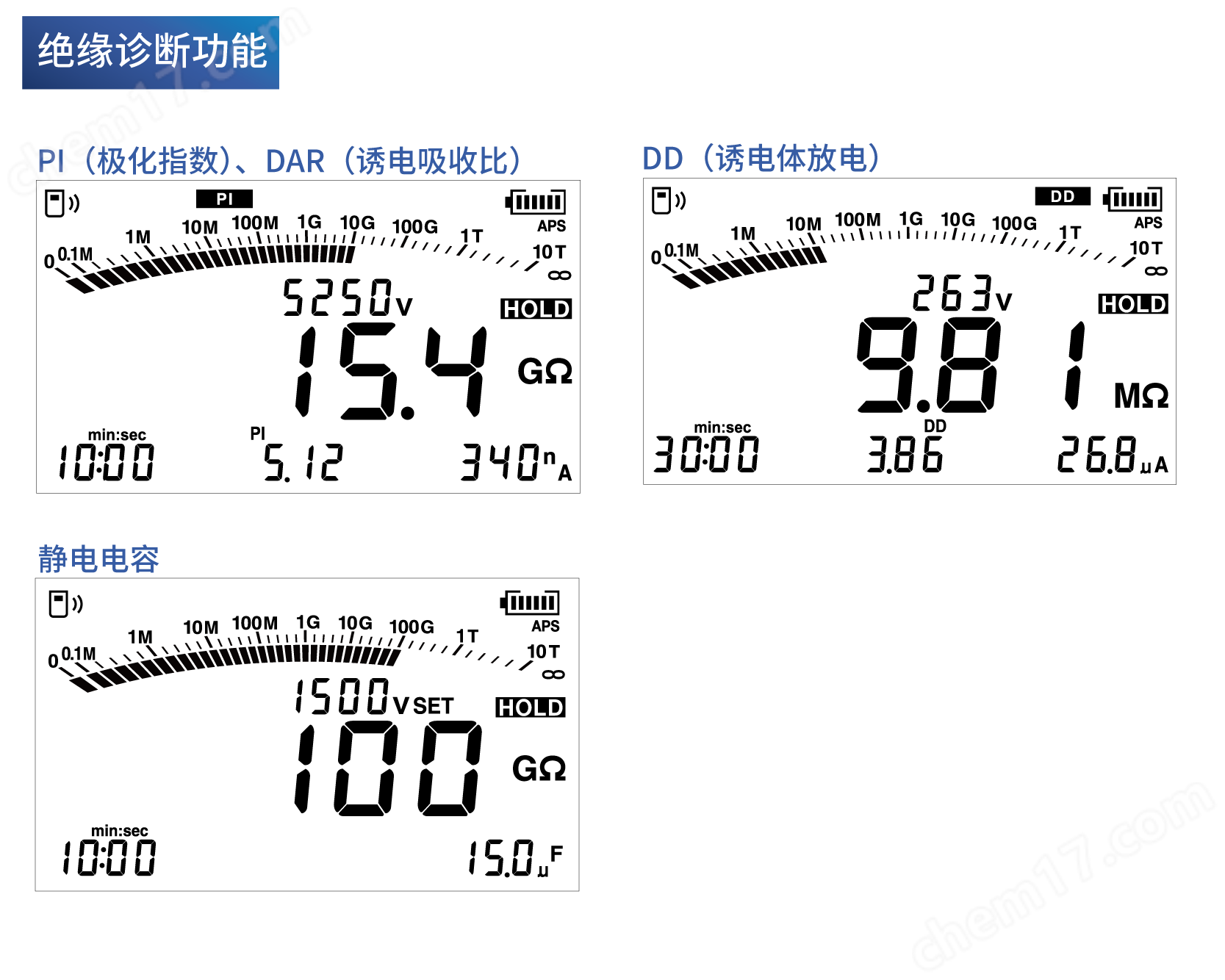 测量结束后,不仅可以显示绝缘电阻值和泄漏电流,还可以显示绝缘判断指数(DAR、PI、DD、静电电容)。
