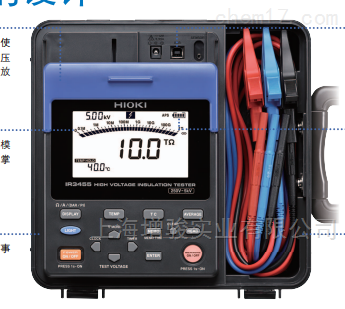 | 功能 | 绝缘判断功能(温度补偿,PI/DAR显示,步进电压试验),数据存储,通讯 (USB 2.0, PC应用软件),自动放电,通电警告显示等 |
